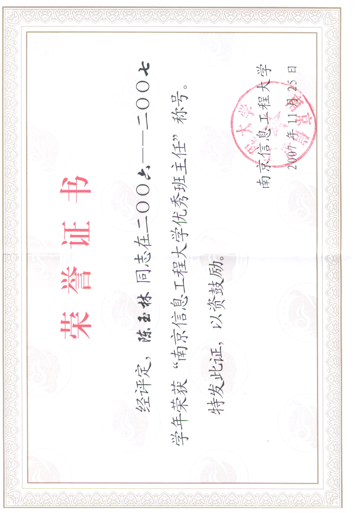 2007年南京信息工程大学优秀班主任
