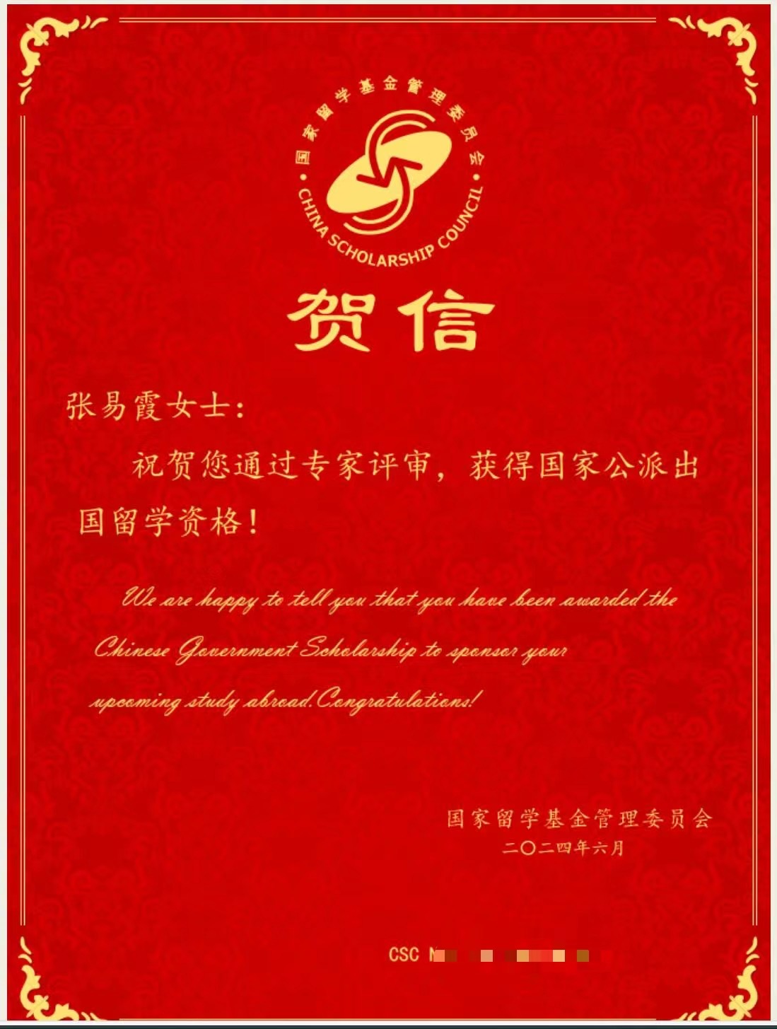研三张易霞同学获国家公派去英国知名大学留学读博,资助4年,为其家庭节省160万人民币。